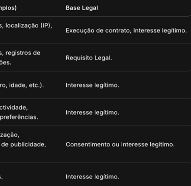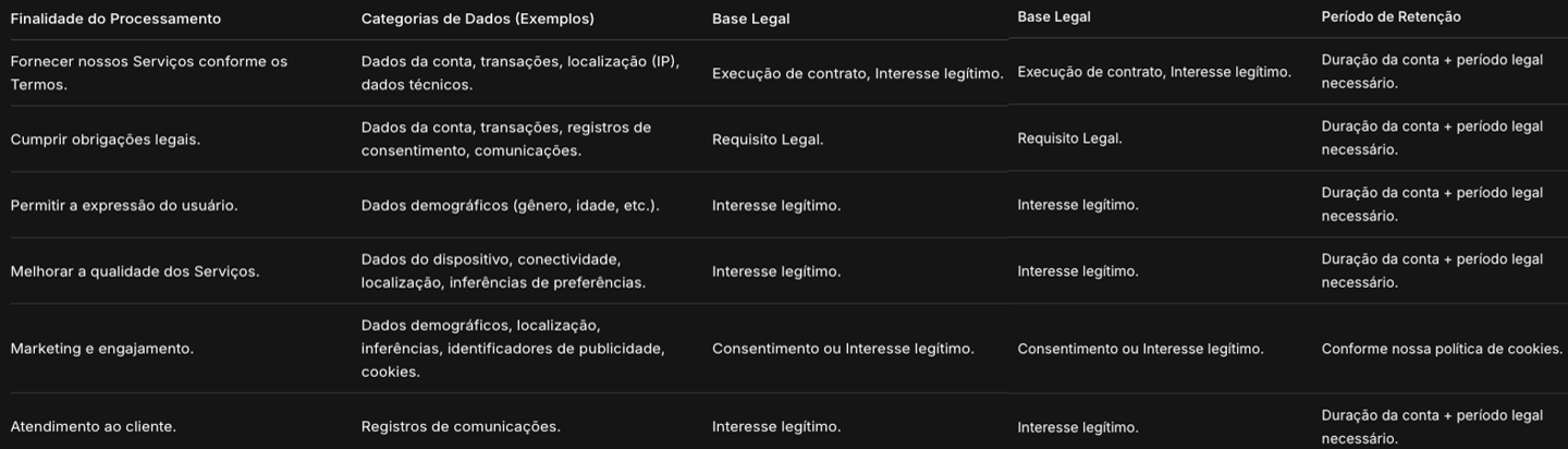 * Categorias de informações processadas, finalidades, bases legais e retenção.